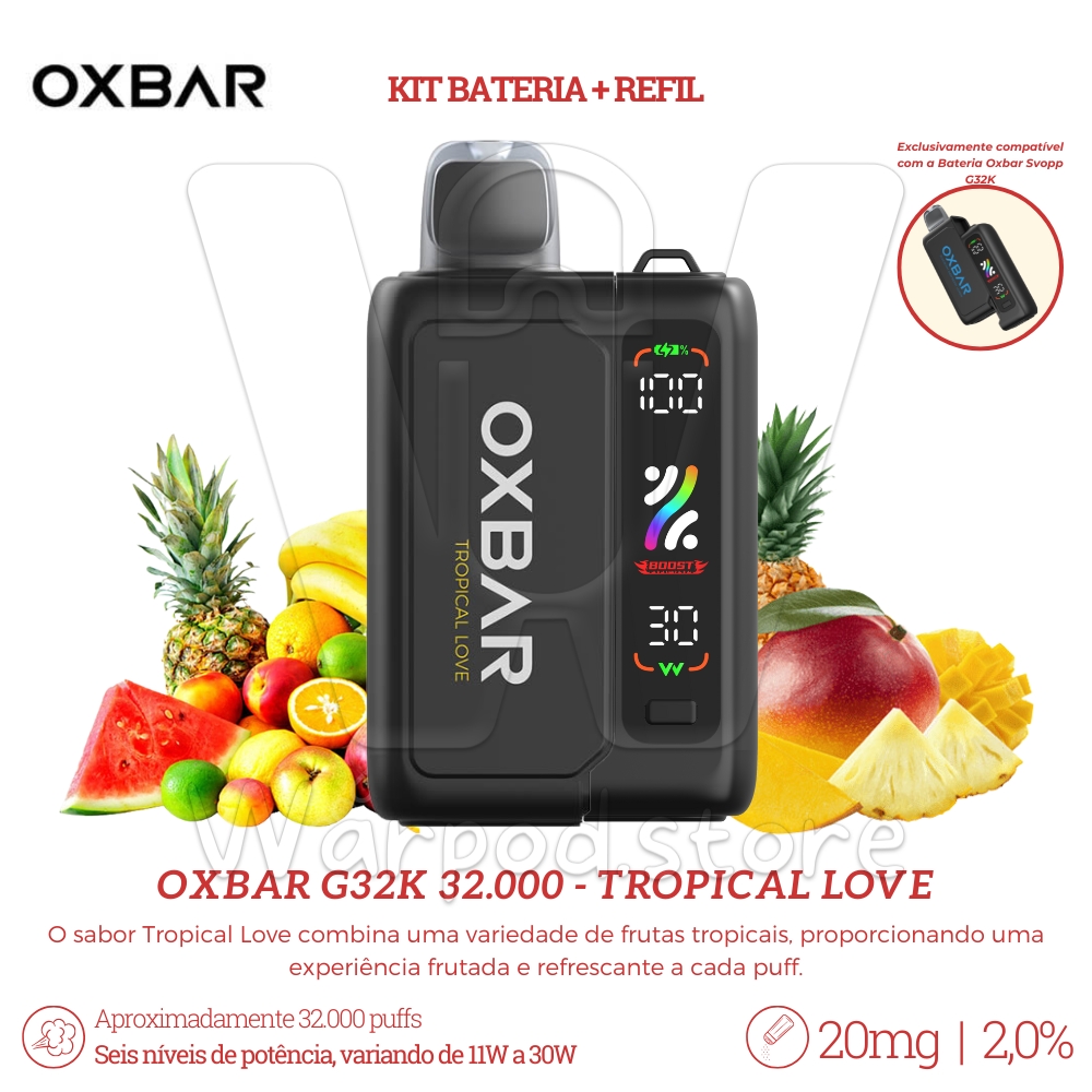 Desfrute de uma experiência de vaping prolongada e saborosa com o Kit Oxbar G32K, que inclui uma bateria recarregável de 1100mAh e um refil descartável com até 32.000 puffs no delicioso sabor Tropical Love.