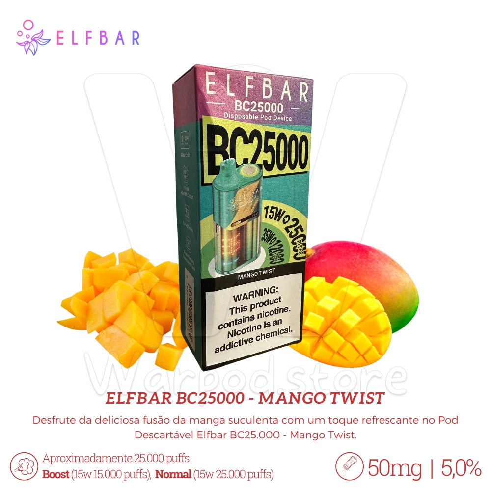 Desfrute da deliciosa fusão da manga suculenta com um toque refrescante no Pod Descartável Elfbar BC25.000 - Mango Twist. Cada puff proporciona uma explosão de sabor tropical, combinando a doçura da manga com uma leve brisa que torna a experiência de vaping leve e revigorante.