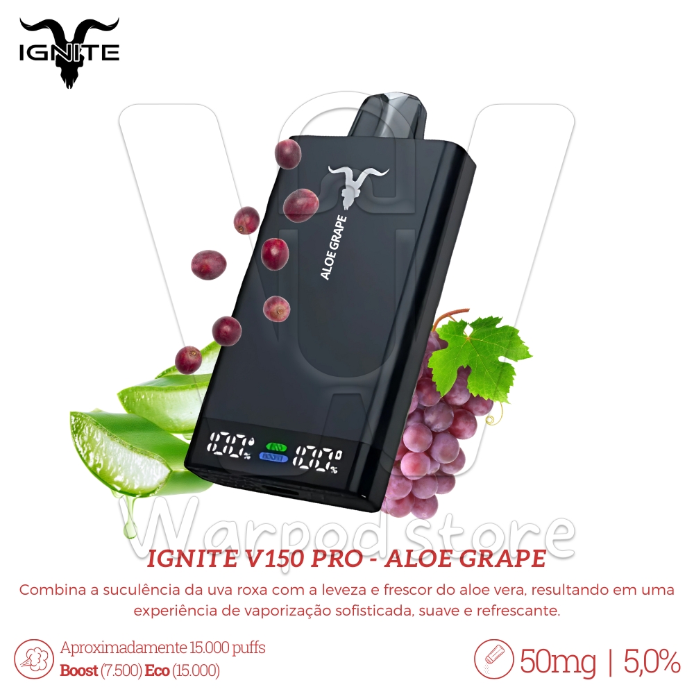 O Aloe Grape da linha Ignite V150 combina a suculência da uva roxa com a leveza e frescor do aloe vera, resultando em uma experiência de vaporização sofisticada, suave e refrescante. O sabor equilibrado entre o frutado doce e o toque herbal proporciona uma sensação única e agradável, ideal para quem procura algo diferente e refinado.