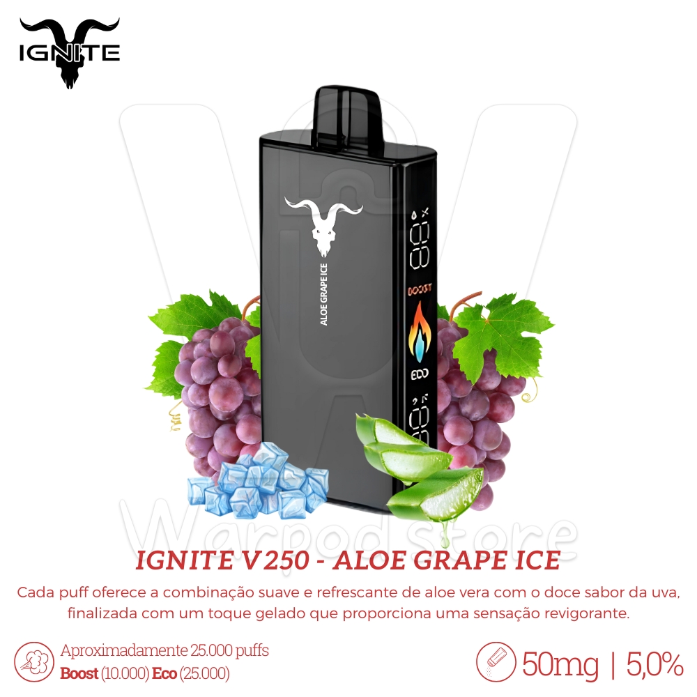 Desfrute de uma experiência de vaping única com o Ignite V250 no sabor Aloe Grape Ice. Cada puff oferece a combinação suave e refrescante de aloe vera com o doce sabor da uva, finalizada com um toque gelado que proporciona uma sensação revigorante.
