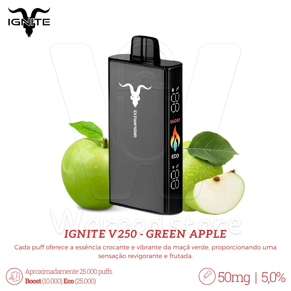 Desfrute de uma experiência de vaping refrescante com o Ignite V250 no sabor Green Apple. Cada puff oferece a essência crocante e vibrante da maçã verde, proporcionando uma sensação revigorante e frutada.