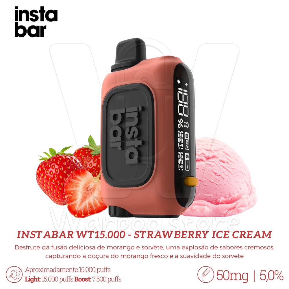 Desfrute da fusão deliciosa de morango e sorvete, uma explosão de sabores cremosos, capturando a doçura do morango fresco e a suavidade do sorvete, perfeita para quem busca uma experiência de vaping frutada e refrescante, no Pod Desc Instabar WT15.000 - Strawberry Ice Cream.