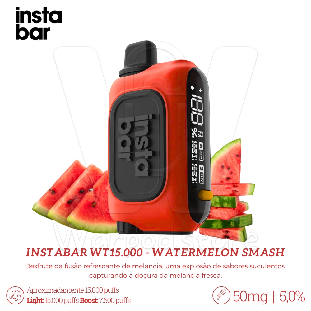 Desfrute da fusão refrescante de melancia, uma explosão de sabores suculentos, capturando a doçura da melancia fresca em cada puff, perfeita para quem busca uma experiência de vaping frutada e refrescante, no Pod Desc Instabar WT15.000 - Watermelon Smash.
