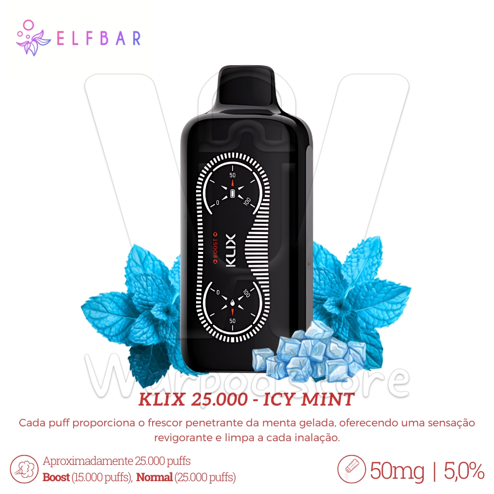 Desfrute de uma experiência de vaping intensamente refrescante com o Klix 25.000 Puffs no sabor Icy Mint. Cada puff proporciona o frescor penetrante da menta gelada, oferecendo uma sensação revigorante e limpa a cada inalação.