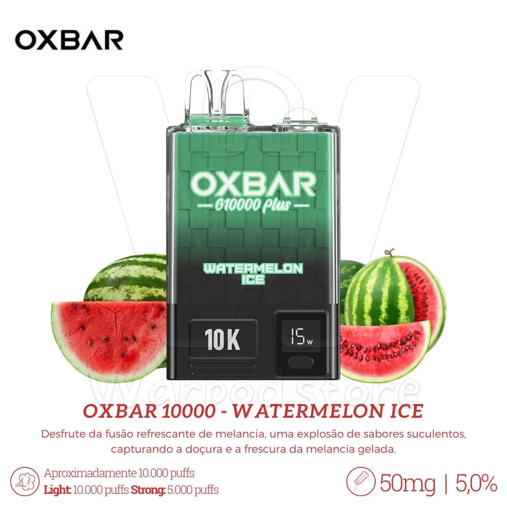 Desfrute da fusão refrescante de melancia, uma explosão de sabores suculentos, capturando a doçura e a frescura da melancia gelada, perfeita para quem busca uma experiência de vaping frutada e refrescante, no Pod Descartável Oxbar 10.000 - Watermelon Ice.