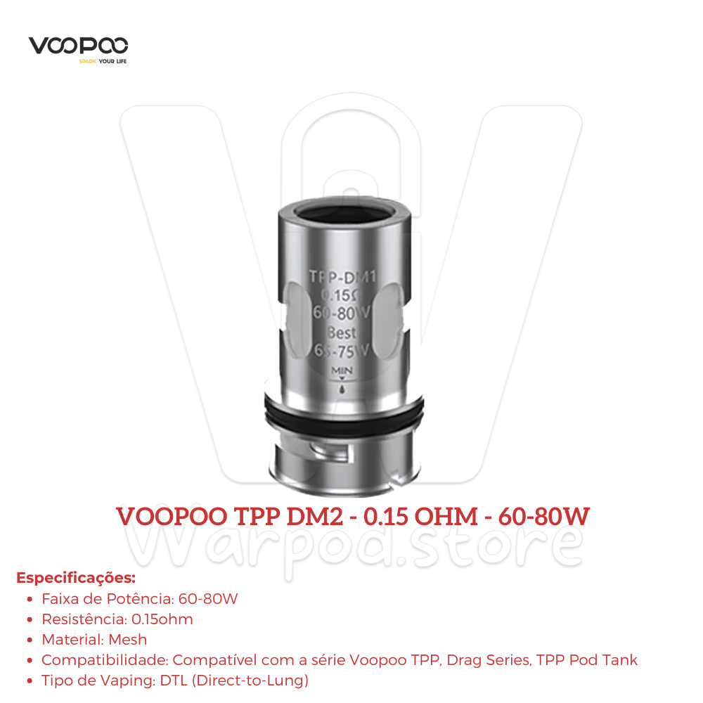 A resistência Voopoo TPP DM1 0.15ohm é projetada para proporcionar uma experiência de vaping excepcional com uma produção de vapor intensa e saborosa. Com uma faixa de potência de 60-80W e resistência de 0.15ohm, esta coil é ideal para vaping DTL (direto para pulmão), oferecendo um desempenho robusto e realçando o sabor dos e-liquids.